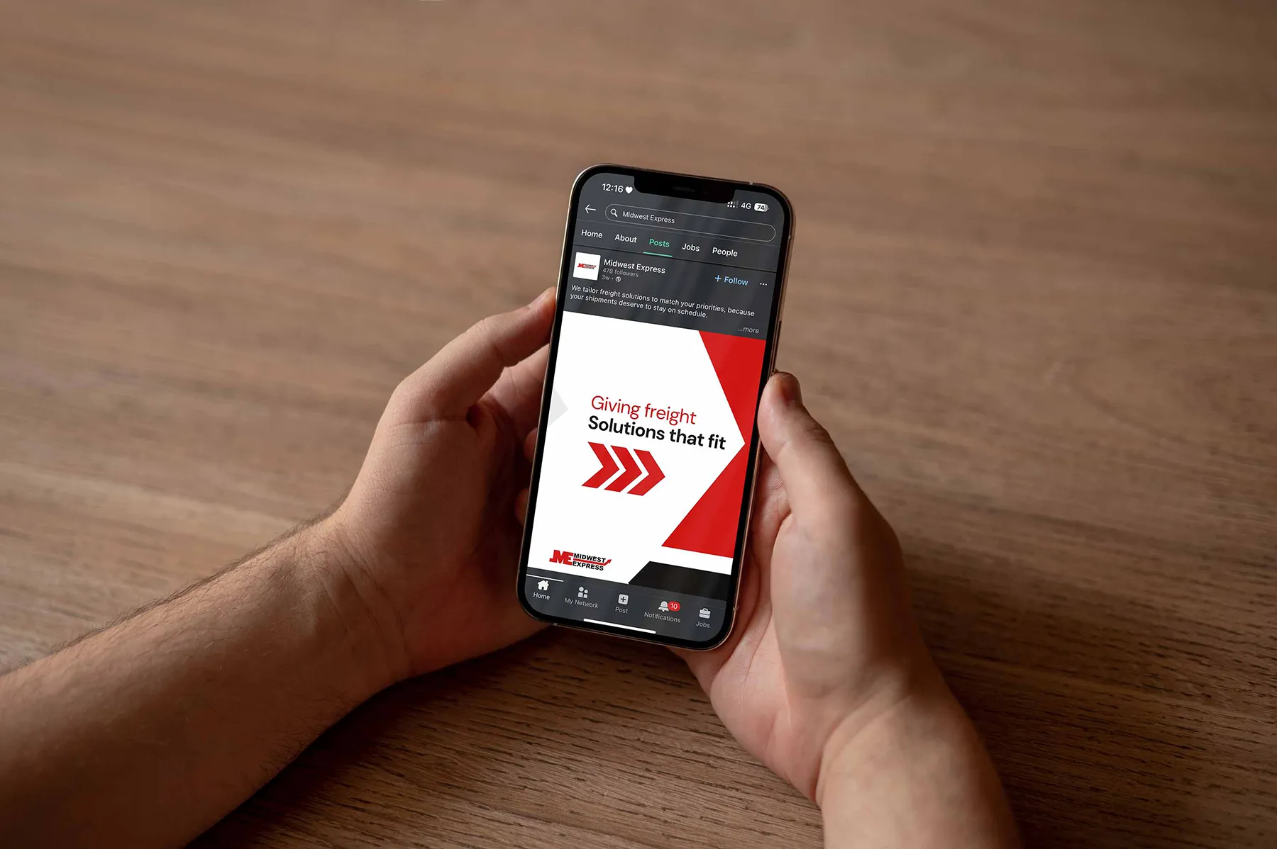 Person holding a smartphone displaying a Midwest Express social media post about freight solutions